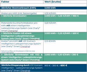 In einem hypothetischenSzenario, bei dem ein E-Auto durchschnittlich 16 Stunden täglich zu Hause geparkt ist und etwa 3.000 kWh Stromverbrauch pro Jahr benötigt, zeigt sich das Potenzial dieser Technologie. Die Berechnungen basieren auf der Annahme, dass die Nutzung von V2G in Verbindung mit einem intelligenten Ladeoptimierungs-System (beispielsweise Charly® Smart Charging) mit dynamischen Stromtarifen und Netzkostenoptimierung (Vermeidung von Lastspitzen) die Stromkosten erheblich senken kann. Hier eine Übersicht der finanziellen Auswirkungen: