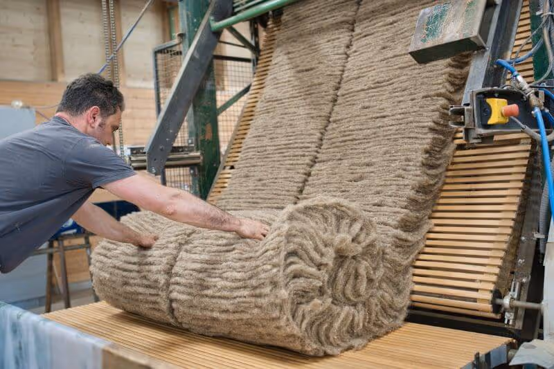 Diese durchläuft vor der Verarbeitung einen gründlichen Reinigungsprozess: Sie wird gründlich mit Kernseife gewaschen, um Wollfett und Verunreinigungen zu entfernen, und anschließend mit Soda nachgespült. So wird die Wolle von störenden Gerüchen befreit. Nur ein kleiner Teil des Lanolins bleibt erhalten, um die Elastizität der Fasern zu erhalten. Selbst eventuelle letzte Restgerüche verfliegen nach kurzer Zeit vollständig.