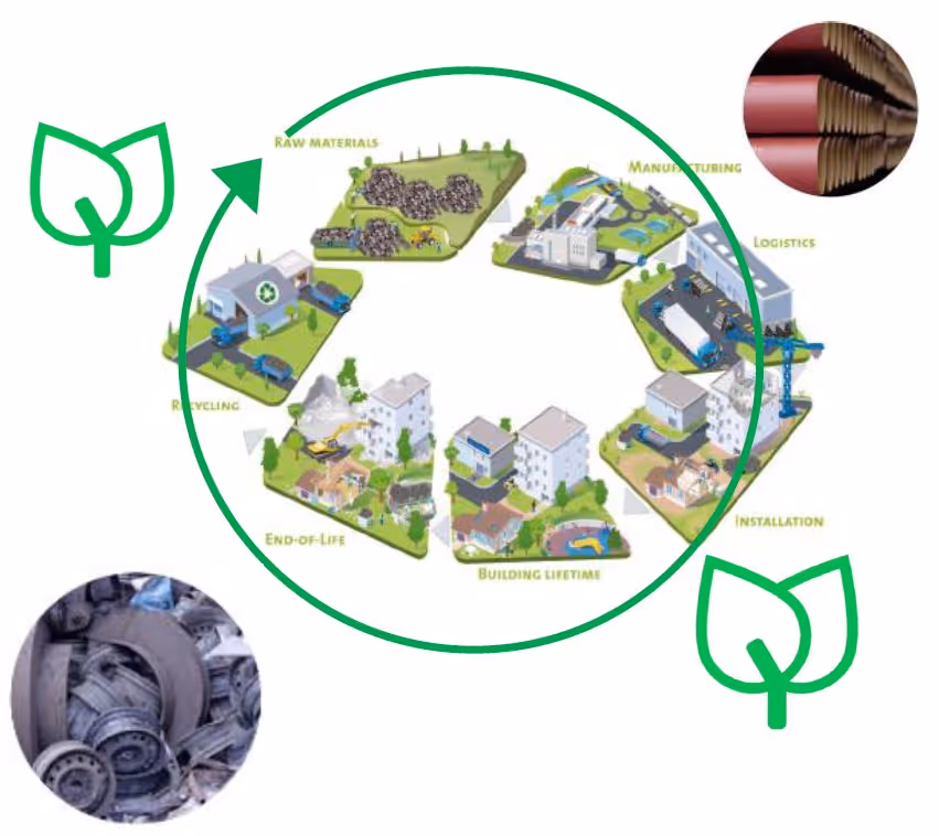 Ein Paradebeispiel für die Auswirkungen der Materialwahl auf die Nachhaltigkeit des Bauprojekts ist die Gebäudeentwässerung: Während bei Gussrohren das Ideal der Kreislaufwirtschaft bereits heute Realität ist, ist das zirkuläre Bauen mit Kunststoffrohren noch illusorisch. Mit ihrer hohen Robustheit, Widerstandsfähigkeit und Langlebigkeit weisen Gussrohrsysteme eine hohe Wirtschaftlichkeit auf und punkten auch bei Nachhaltigkeitsbetrachtungen. Bei Umweltaspekten wie Ressourcenverbrauch, Carbon Footprint und Recycelbarkeit überzeugt das Material Guss ebenfalls: Gussrohrsysteme wie PAM-GLOBAL® S können zu 100 Prozent wiederverwertet werden. Die abriebfeste Epoxidschicht im Innern der Rohre, die eine Korrosion des Graugussmaterials zuverlässig verhindert, hat eine Schichtdicke von nur 130 µm bzw. 0,13 mm. Deshalb lassen sich die Gussrohre wie ein Monomaterial verschrotten und als recycelter Metallwerkstoff in der Produktion wiederverwenden. Rohrsysteme aus Kunststoff hingegen haben bei einer Nachhaltigkeitsbetrachtung materialbedingt ein Problem: Noch basiert die organische Chemie weitgehend auf fossilen und damit aus ökologischer Sicht problematischen Kohlenstoffquellen wie Erdöl, Kohle oder Erdgas. Hinzu kommt eine niedrige Rezyklatquote, was mit dem Materialmix aus verschiedenen Kunststoffsorten und Füllmaterialien zusammenhängt. Derzeit landen also heute verbaute Kunststoffrohre am Ende ihres Lebenszyklus weitgehend als Abfall in der thermischen Verwertung. Und hier geht es um bedeutende Mengen an Kunststoff: Etwa ein Viertel aller Kunststoffprodukte – knapp 3 Millionen Tonnen jährlich – werden für die Baubranche produziert, die voraussichtlich nicht in den Wertstoffkreislauf zurückgeführt werden können.