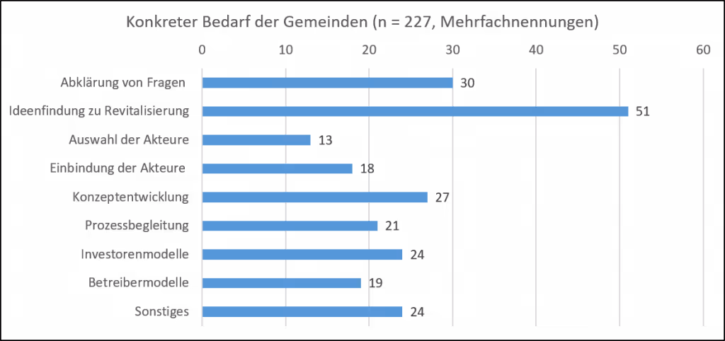 Identifiziert wurden somit 277 Brachen mit insgesamt 110,60 Hektar, über die durch den Datenverschnitt im DORIS wichtige standortspezifische Eigenschaften über das Areal vorhanden sind. So konnten beispielsweise die Grundstücksgrößen erfasst werden, die Aufschluss über die Größenverteilung der Brachen geben. Es hat sich gezeigt, dass 80 % der Brachen über eine Grundstücksgröße von unter 10.000 m² verfügen und grundsätzlich kaum großflächige Areale brach liegen. Zur Revitalisierung der Brachen gaben 49 % der Gemeinden mit Brachenmeldung an, dass sie Unterstützungsbedarf sehen. Vor allem die Ideenfindung zur Revitalisierung stellt viele Gemeinden vor Herausforderungen. Aber auch die Abklärung von Fragen zu Konzeptentwicklungen, Investorenmodellen und Prozessbegleitungen sind aktuelle Bedarfe von den Gemeinden. Einige Successstories von Brachenrevitalisierungen gibt es bereits, bei denen die angesprochenen Herausforderungen erfolgreich gemeistert wurden.
