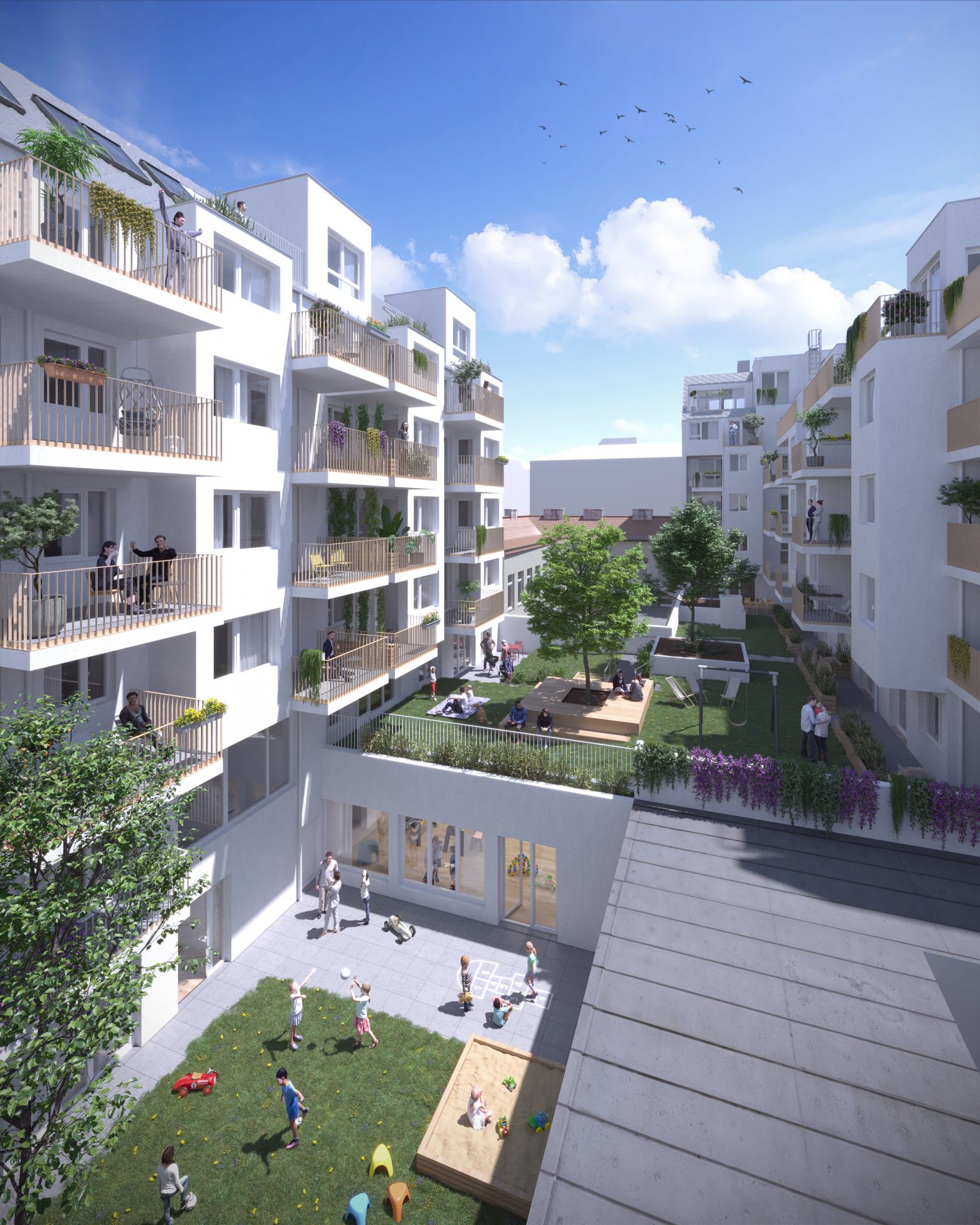 Ein markanter Hingucker mit viel Wohngefühl, ein genussvolles Erdgeschoss-Lokal, attraktiver Arbeitsraum. Möglichkeit zur Kinderbetreuung, viel Grün. Das ist der „G‘mischte Block“, der einen sozial, wie ökologisch nachhaltigen Impuls für das Grätzel hinter dem neuen Hauptbahnhof schafft. Das Projekt liegt im Herzen Favoritens, nicht weit von der Einkaufsmeile Favoritenstraße und ist Kandidat der IBA Wien und Teil von WieNeu+. Im Zentrum steht das Thema des „neuen sozialen Wohnens“. Stadt-, wohnungs- und sozialpolitische Instrumente und Strategien werden dabei neu miteinander verknüpft. So wird ein Beitrag zur Stadtteilaufwertung als klimafittes Gebäude geleistet, um auch späteren Generationen hohe Lebensqualität zu gewährleisten.